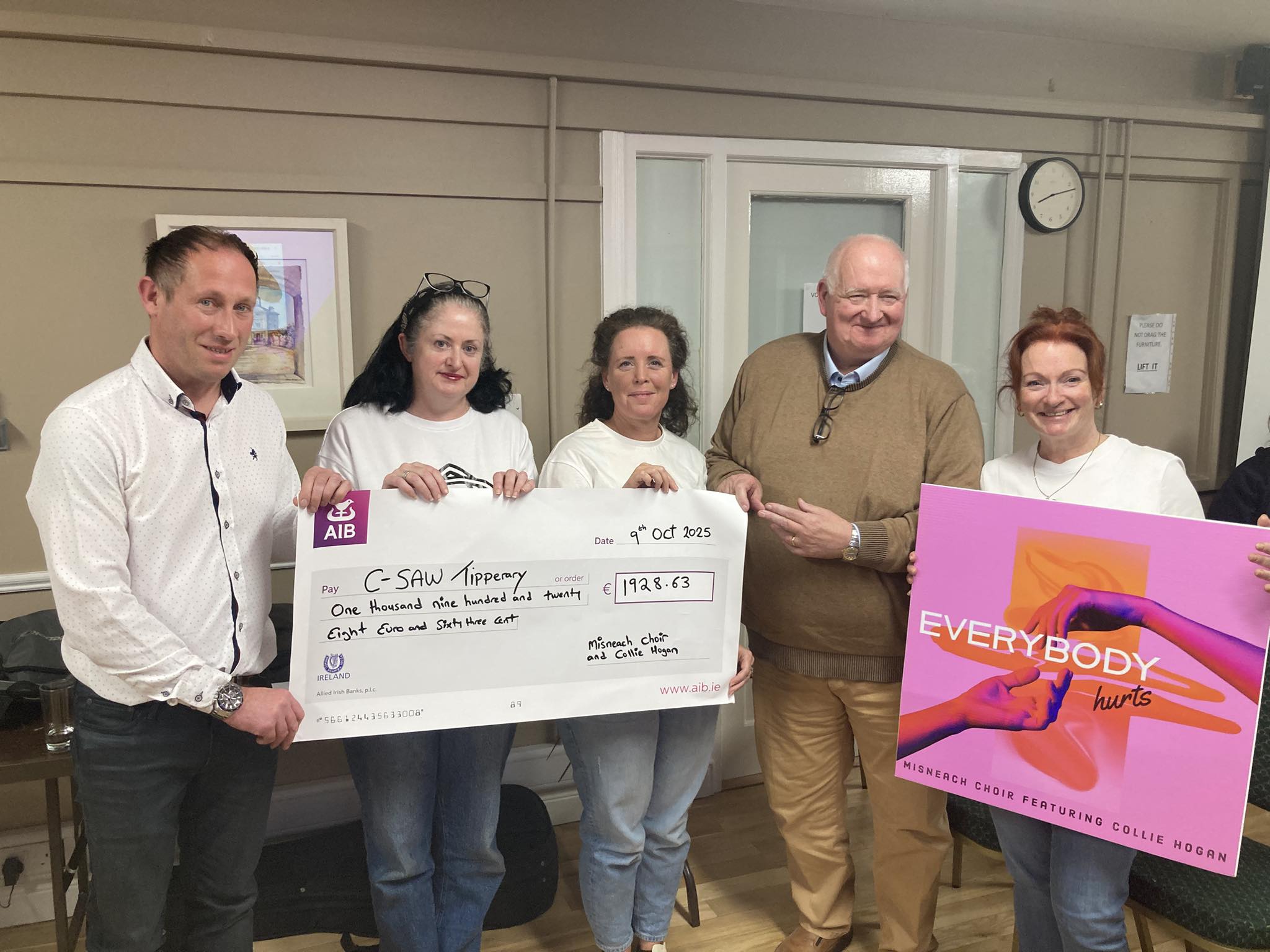 On Thursday night, 9 October last, Joe Leahy and Brendan Murphy accepted a cheque on behalf of C-SAW for €1,923.63 from Nenagh's Misneach Choir.